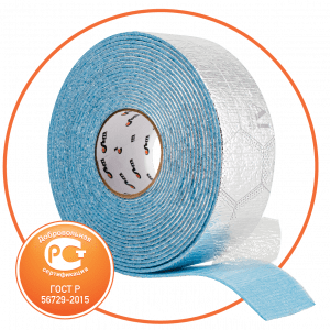 Самоклеящаяся лента на основе вспененного полиэтилена, голубого цвета, с закрытой ячеистой структурой, дублированная алюминиевой фольгой с защитой от подделок - универсальной печатью - с одной стороны и закрытым клеевым слоем с другой.